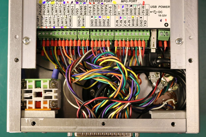 I laid out the openings in the aluminum case for the pendant and cut out the front panel using my Dewalt scroll saw. The end panel couldn’t be cut on the scroll saw so I used a nibbling tool to make the openings for the USB and DB37 connectors. I also added aluminum L channels on the back of the case in order to mount the control panel: