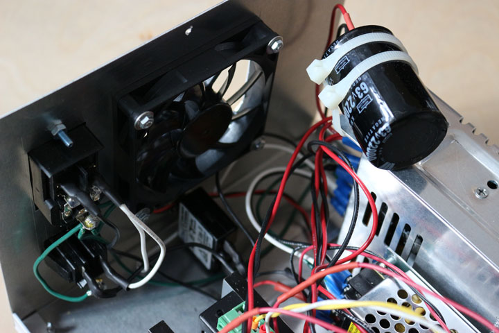 I couldn’t find an off-the-shelf enclosure of the size that I wanted for the power supply module so I made my own from aluminum sheet using my ShopFox box and pan brake and plate shear. I ran the AC power from the switched inlet to a 10A circuit breaker, and then to the two power supplies. I also added an AC outlet to run the cooling pump for my 2.2KW water cooled spindle. On the 36V 11A supply for the stepper motors, I added a 22,000 microfarad capacitor to help absorb the current spikes from the stepper drivers.
